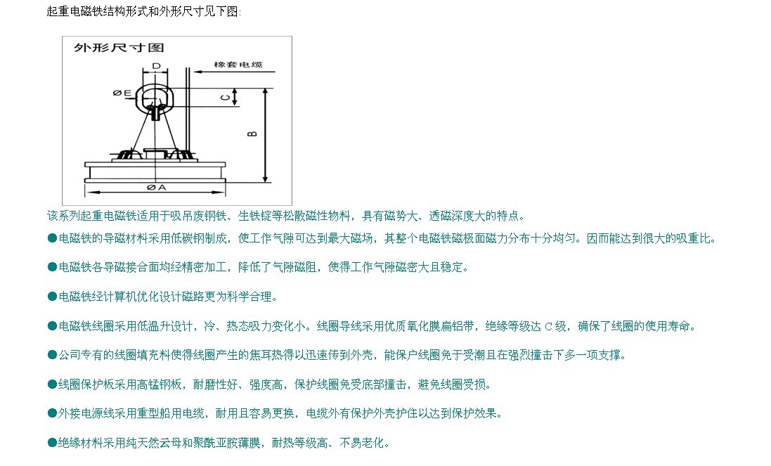 1、產品經計算機優化設計,磁路更為科學合理,氣隙磁密大,透磁深度深。線圈采 用鋁線,線圈保護采用耐磨性好、抗沖擊能力強的軋制高錳鋼板。自重輕、耗能 低、起重量大、使用壽命長。