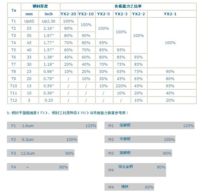以上圖表為參考值,安全系數×3.5倍,本永磁吊裝器的吊重能力標示為測試吸力的1/4。如LS2-1的吊重能力為1000kg,但其實際測試吸力為大于4000kg。(大的安全系數,為考慮及確保使用的安全因素)如欲吊的鋼材超出上述吊重范圍,請于吊離鋼材前先測試,無安全之慮后再行使用,如因故發生危險,則本公司恕不負責。本產品由m.shppa.cn提供