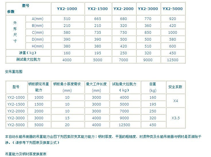YX2 系列自動永磁吊裝器參數
